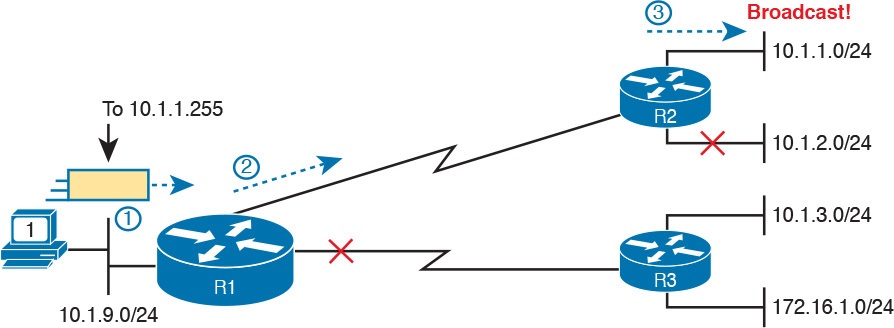 Note that these two routes overlap: a packet sent to 10.1.1.9 that arrives at the router would match both routes. When that happens, routers use the most specific route (that is, the route with the longest prefix length). So, a packet sent to 10.1.1.9 would be forwarded to next-hop router 10.9.9.9, and packets sent to other destinations in subnet 10.1.1.0/24 would be sent to next-hop router 10.2.2.2.