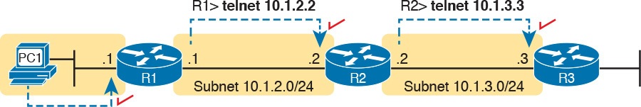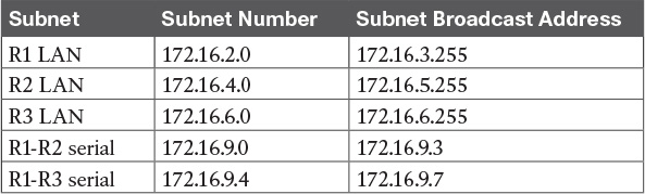 Note that most sites use dynamic routing protocols to learn all the routes to remote subnets. However, when not using a dynamic routing protocol, the routers would need to configure static routes. For example, if the routers had only the configuration shown in the examples so far, PC A (from Figure 18-15) would not be able to receive packets back from PC B, because Router R2 does not have a route for PC A’s subnet. R2 would need static routes for other subnets, as would R3.