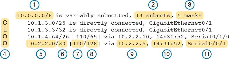 Finally, note that while the show ip route command lists the administrative distance of most routes, as the first of two numbers inside two brackets, the show ip route subnet command plainly lists the administrative distance. Example 18-11 shows a sample, matching this most recent example.