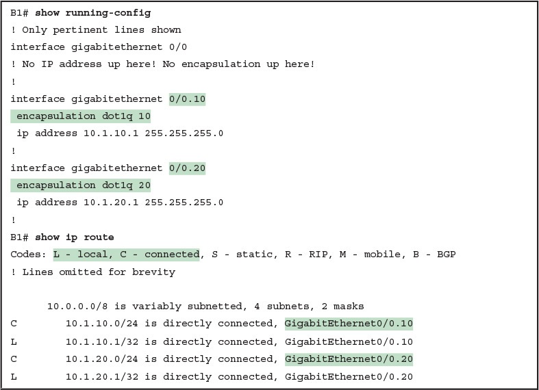 Besides just scanning the configuration, the show vlans command on a router spells out which router trunk interfaces use which VLANs, which VLAN is the native VLAN, plus some packet statistics. Example 18-5 shows a sample, based on the Router B1 configuration in Example 18-4 (bottom half), in which native VLAN 10 is configured on subinterface G0/0.10. Note that the output identifies VLAN 1 associated with the physical interface, VLAN 10 as the native VLAN associated with G0/0.10, and VLAN 20 associated with G0/0.20.