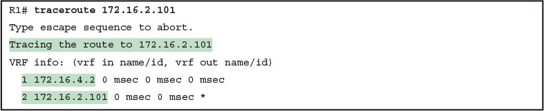 As an example, Figure 18-14 shows a small IP network. The diagram actually holds a subset of Figure 18-3, from earlier in this chapter, with some of the unrelated details removed. The figure shows only the details related to a static route on R1, for subnet 172.16.2.0/24, which sits on the far right. To create that static route on R1, R1 will configure the subnet ID and mask, and either R1’s outgoing interface (S0/0/0), or R2 as the next-hop router IP address (172.16.4.2).